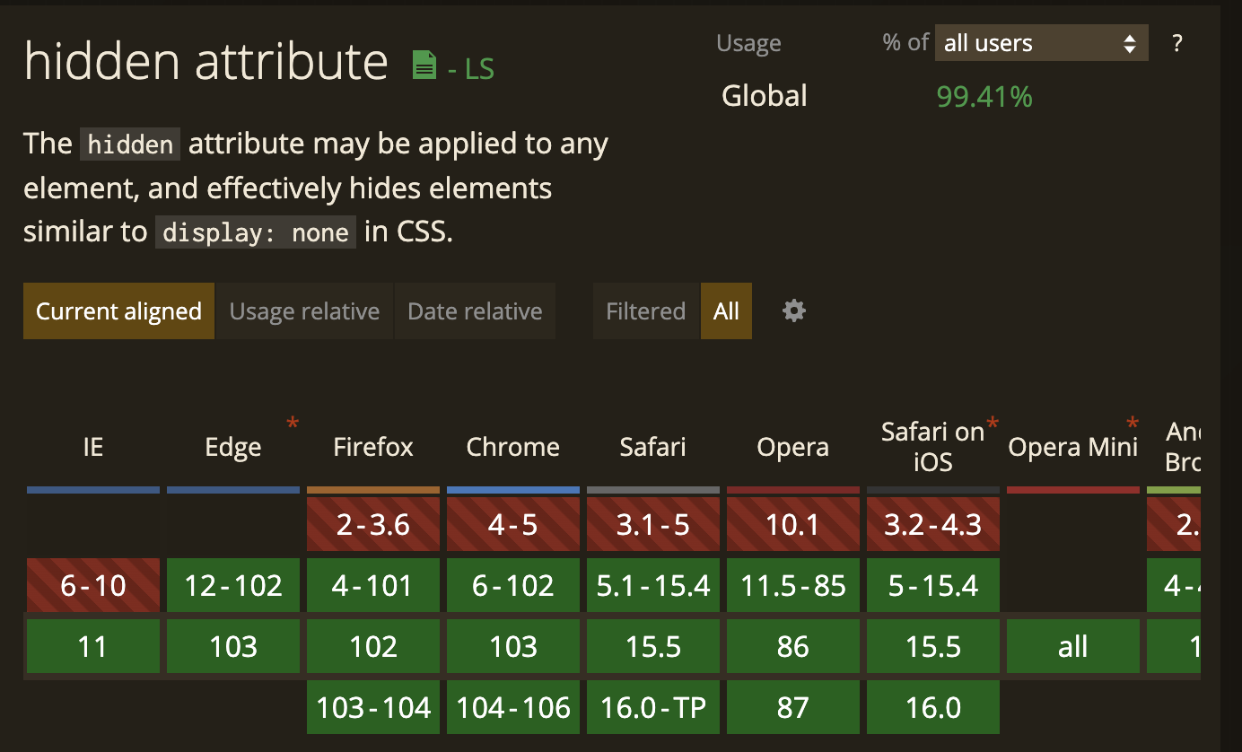 html hidden ์์ฑ์ ์๋์ ์ผ๋ก ์ต์ ๋ฌธ๋ฒ์ด์ฌ์ ์ค๋๋ ๋ธ๋ผ์ฐ์ ์์๋ ์ง์ํ์ง ์๋๋ค